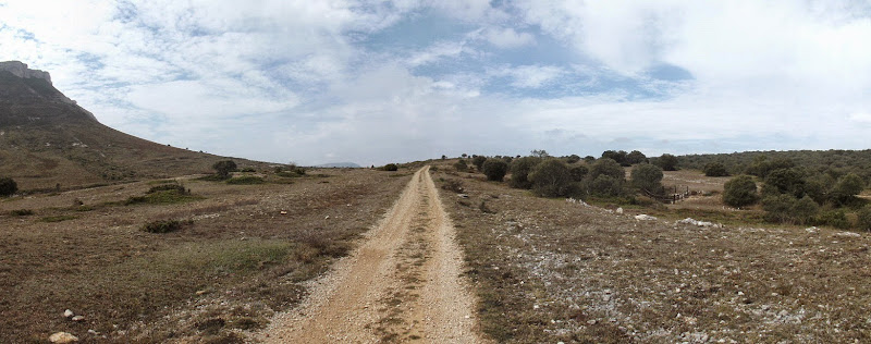 The path rises gradually to a low pass. The underground drainage has a very specific effect on the local flora. The natural vegetation would have been a vast forest of evergreen oaks (Quercus ilex), as still can be seen on our right hand. However, deforestation and centuries of grazing resulted in the arid surface to our left.